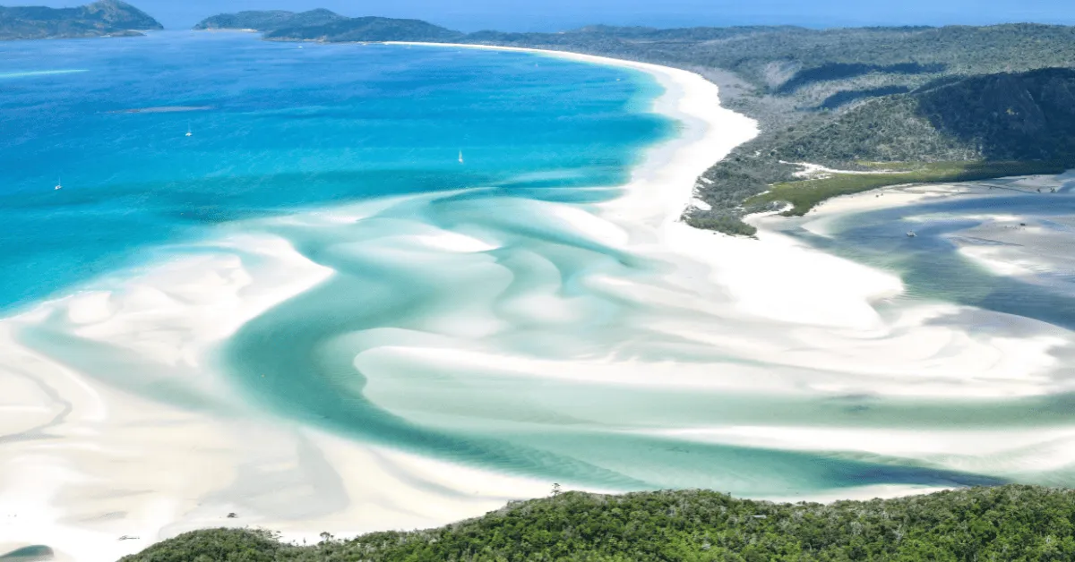 Marvel at the swirling blend of turquoise waters and white sands from Hill Inlet Lookout, offering breathtaking panoramic views.